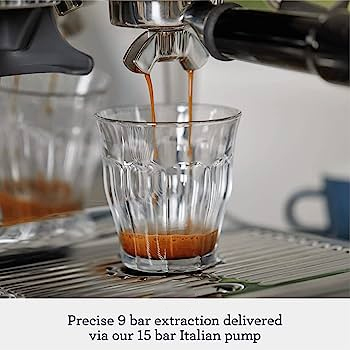 Full bodied coffee with rich and complex flavors is created using the ideal dose of 18g of freshly ground beans delivered by a professional style 54mm stainless steel portafilter.